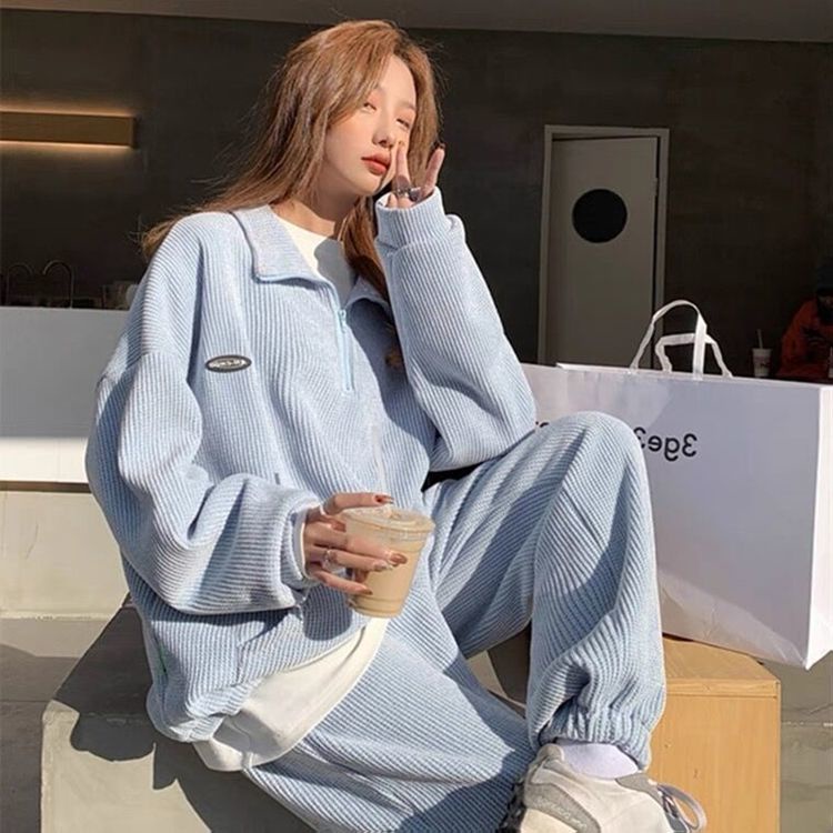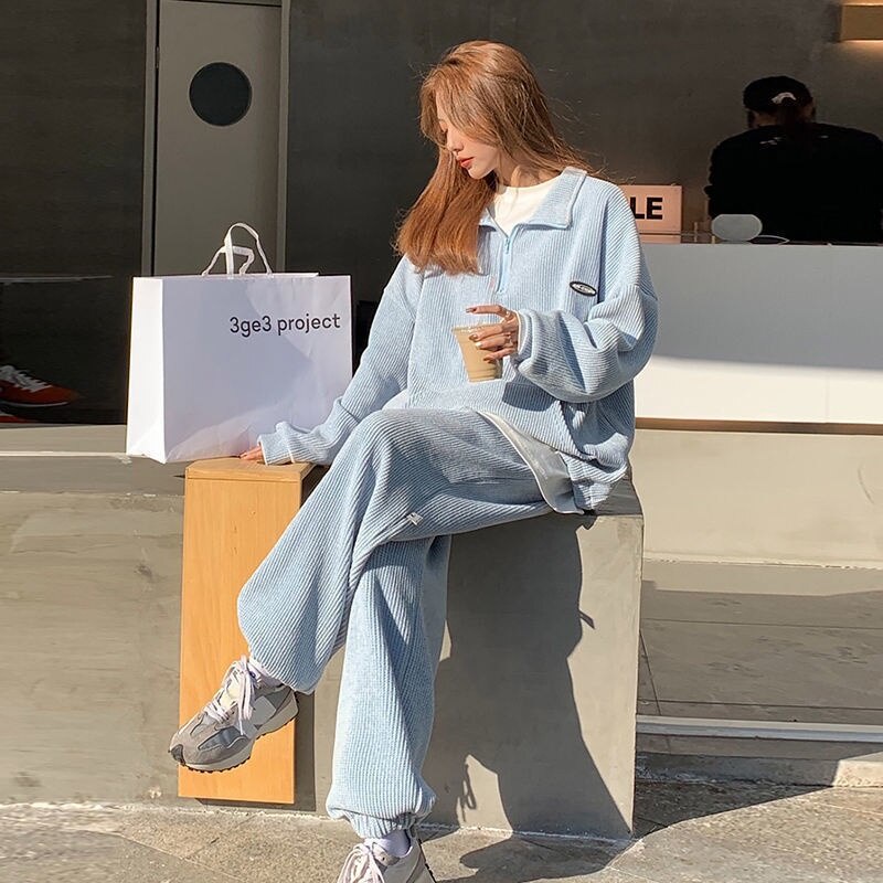 Bộ đồ thể thao nữ thu đông cộng nhung dày sinh viên Phiên bản hàn quốc thời trang lỏng lẻo muối giản dị chạy bộ hai mảnh