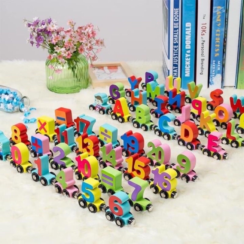 Đoàn tàu nam châm số học được làm từ gỗ tự nhiên, màu sắc bắt mắt, mịn, khiong bong tróc sơn