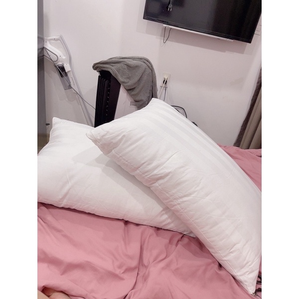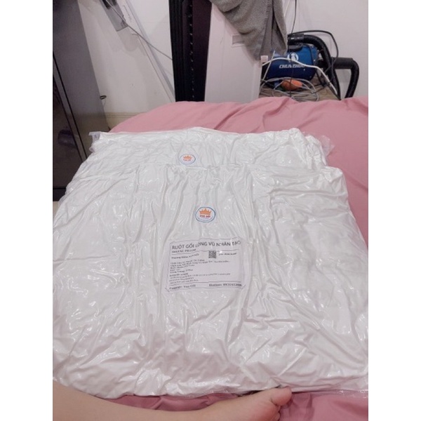 Một cặp gối làm bằng chất liệu lông vũ nhân tạo có kiach cỡ 50 x 70 cm cao. Màu trắng, ép chân không
