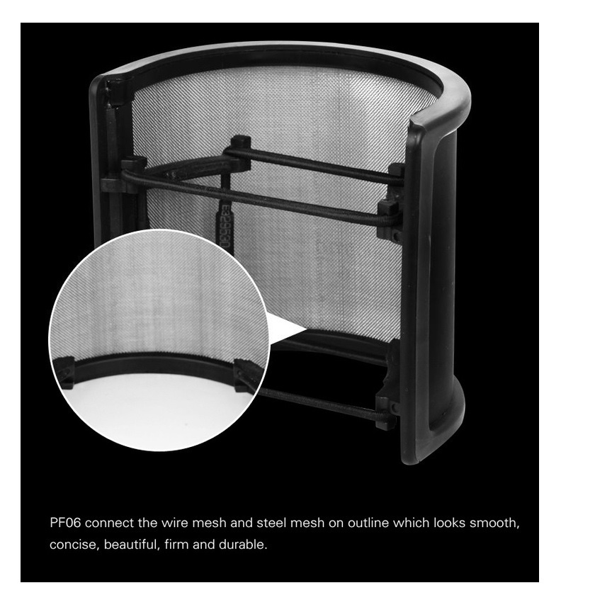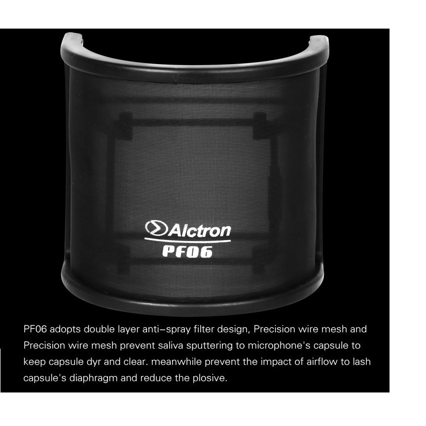 Là loại pop filter đặc biệt nhỏ gọn, gắn trực tiếp vào micro bằng các khớp nối và dây cao su co dãn tùy ý, Alctron PF06 là giải pháp màng lọc âm bảo vệ mic tuyệt vời cho không gian thu âm nhỏ hẹp hoặc micro condenser để bàn.