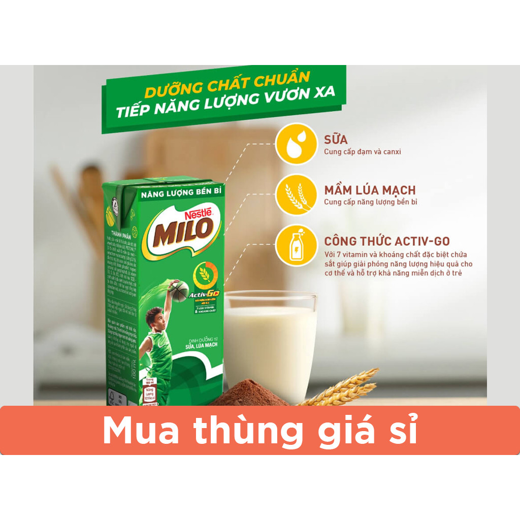 Sản phẩm sữa cacao, socola thơm ngon, giàu canxi và protein giúp cho cơ thể phát triển. Đặc biệt, thương hiệu sữa ca cao lúa mạch Milo nổi tiếng rất được các bé yêu thích và tin dùng. Thùng 48 hộp thức uống lúa mạch Milo Active Go 180ml cung cấp nguồn năng lượng dồi dào cho bé hoạt động mỗi ngày.